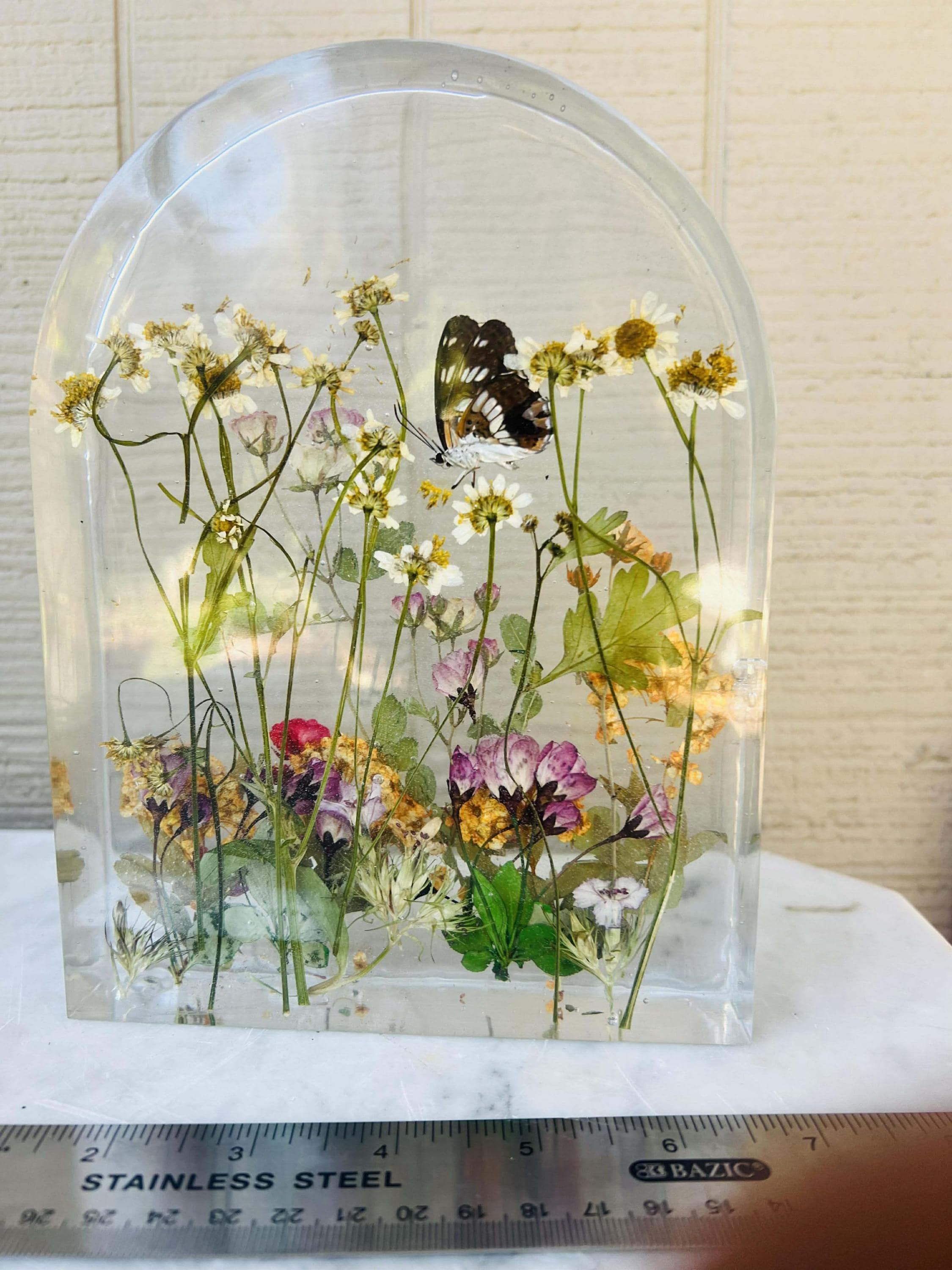 This piece features a real Hackberry Emperor butterfly carefully preserved inside a botanical resin arch surrounded by delicate dried flowers.