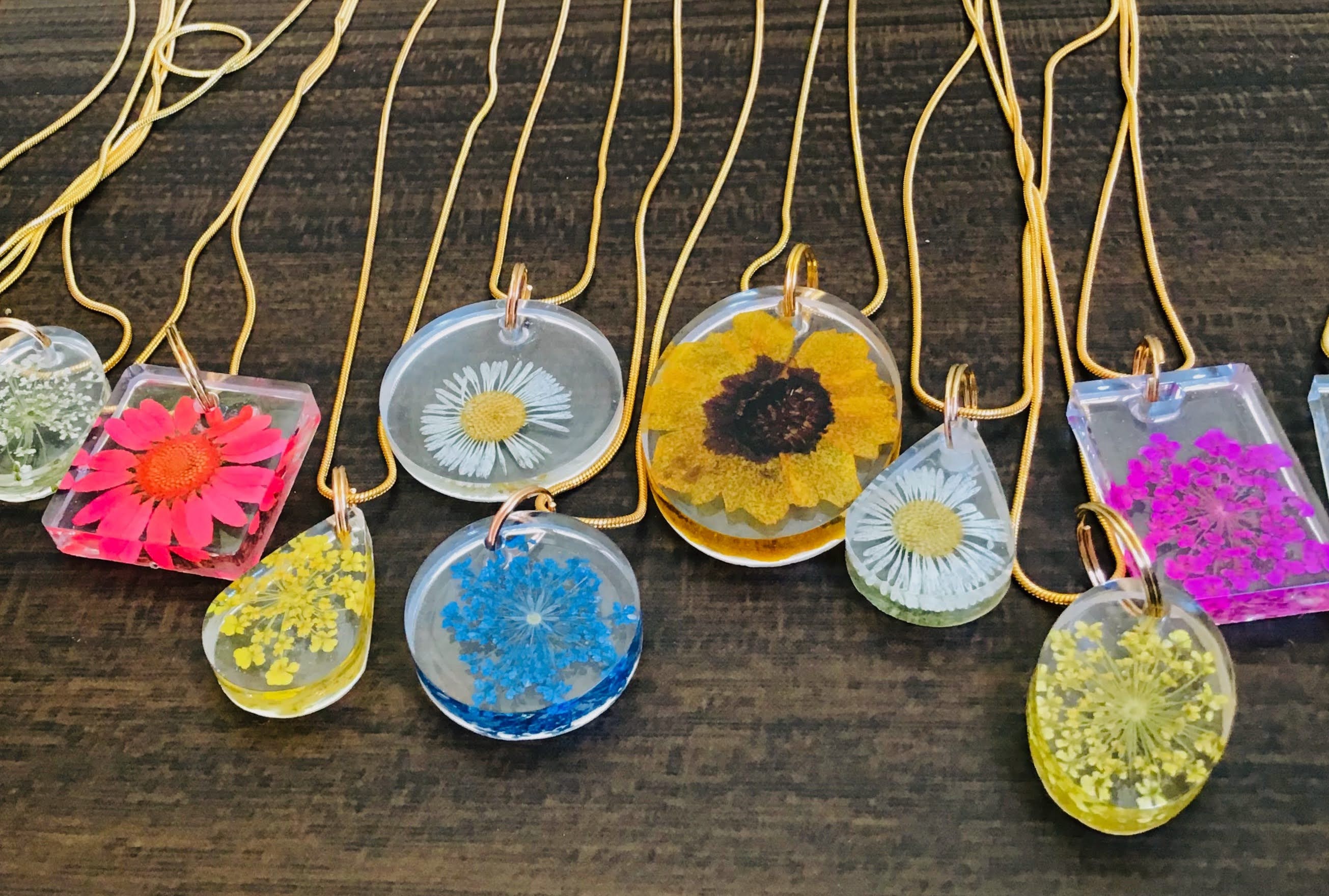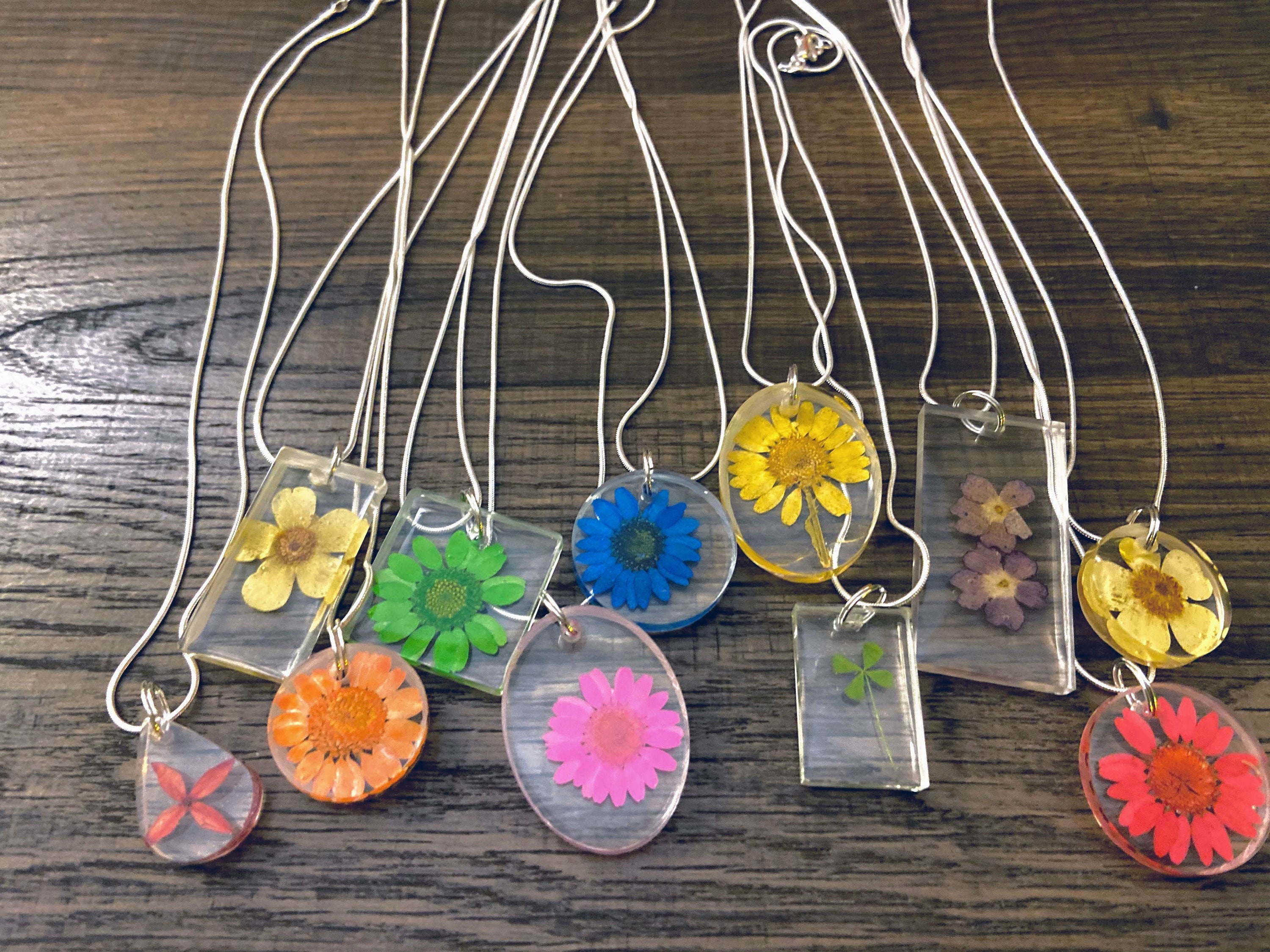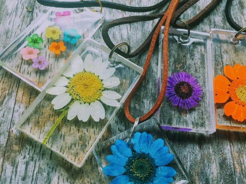 you will receive one preserved botanical specimen necklace of my choosing, both flower pendant as well as chain (normally, the chain is goldtone and slinky, about 16 to 18 inches in length). If you have a preference on pendant shape and or preference on the color and/or type of flower preserved within, you can message me with these requests and I will try my best!